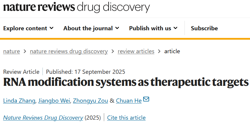 《Nat Rev Drug Discov》| IF=101.8!何川团队爆款综述:RNA修饰系统作为疾病治疗新靶点