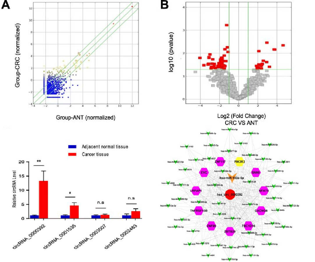 结直肠癌(CRC)是全球范围内发病率和死亡率均较高的恶性肿瘤之一。随着高通量测序技术的应用,在肿瘤组织中鉴定出大量circRNA,部分circRNA已被证明可作为癌基因,但其在结直肠癌中的异常表达原因尚不完全清楚。 云序用户上海中医药大学龙华医院季光教授课题组通过环状RNA测序分析了6对CRC组织和邻近正常组织中circRNAs的表达谱。与正常邻近组织和细胞系相比,CircRNA_0000392在CRC中显著上调,其表达水平与CRC恶性进展呈正相关。在机制上,进一步结合环状RNA测序数据,通过生物信息学分析预测基于circRNA_0000392的circRNA-miRNA-mRNA相互作用,结合RNA pull down、荧光素酶等实验确定了circRNA_0000392可以充当miR-193a-5p的海绵,调节PIK3R3的表达。