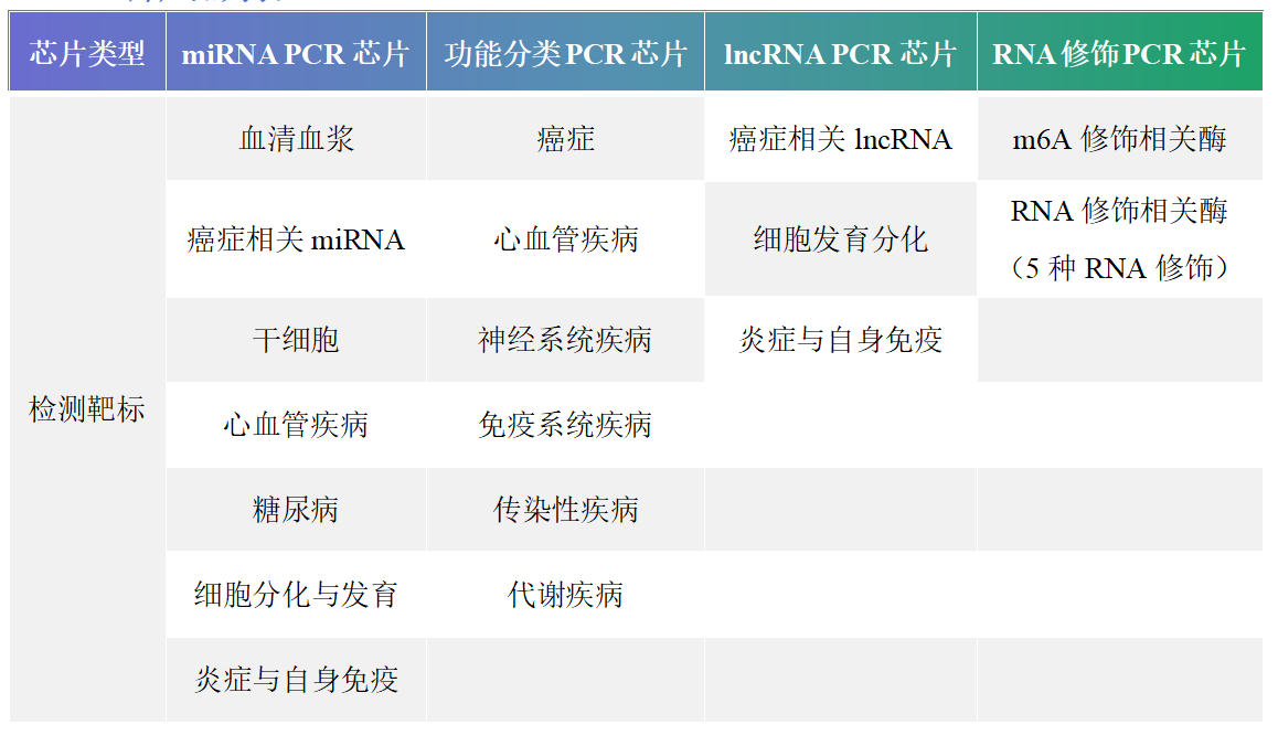 PCR芯片结合了实时定量PCR技术灵敏可靠和微阵列技术同时检测多个基因的优势,是分析特定信号通路或生物学过程中相关基因表达水平的有力工具,能够帮助客户快速剖析表观转录组学(RNA修饰、lncRNA、miRNA)、信号通路与细胞功能或疾病的关系。PCR芯片应用领域很广泛,预制的商业化PCR芯片达数百款,涵盖了RNA修饰、肿瘤、心血管疾病、神经系统疾病、免疫、发育、代谢、干细胞、细胞生物学、细胞信号通路、miRNA和LncRNA等热门研究领域。
