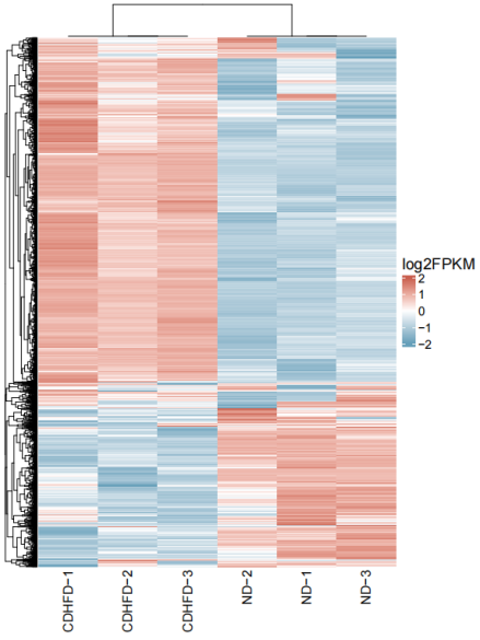 聚类图展示样本和基因的聚类关系及表达丰度。横坐标表示样本聚类,样本间基因表达越相似,聚类越紧密;纵坐标表示基因聚类,基于基因在样本中的表达相似性。颜色深浅反映基因表达水平,红色越深表示上调越显著,蓝色越深表示下调越显著。