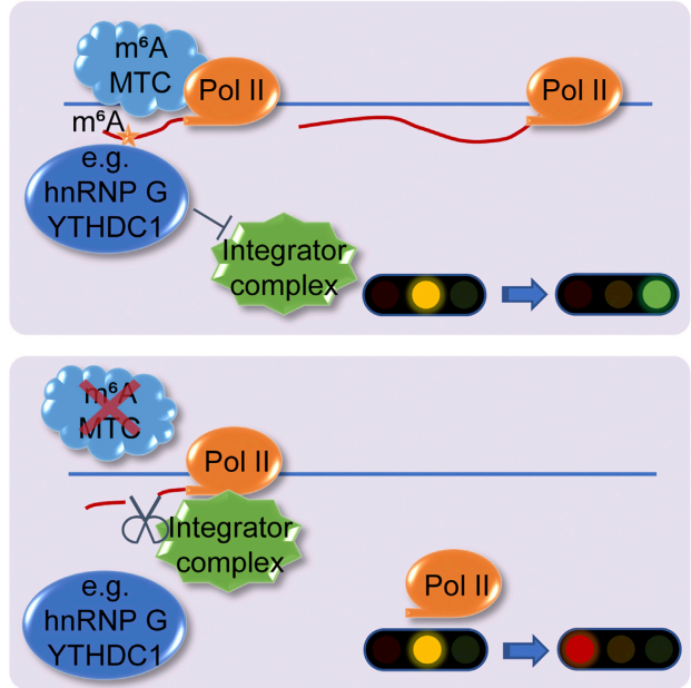 N6-甲基腺苷(m6A)通过共转录沉积在mRNA上,但m6A对转录的可能作用仍知之甚少。该研究证明METTL3/METTL14/WTAP作为m6A甲基转移酶复合物(MTC)定位于许多启动子和增强子区域,并将m6A修饰沉积在新生转录本上,包括pre-mRNA、启动子上游转录本(PROMPT)和增强子RNA。PRO-seq分析表明,在METTL3缺失的细胞中,源自启动子和增强子的新生RNA显着减少。此外,受Integrator复合体调控发生提前转录终止的基因区域中METTL3含量降低,提示METTL3与Integrator复合体可能存在拮抗作用。与此一致的是,研究发现当MTC或核内m6A结合蛋白缺失时,Integrator复合体组分INTS11在启动子和增强子区域的富集水平升高。综上,研究结果表明MTC介导的m6A修饰能保护新生RNA免受Integrator复合体介导的转录终止,从而促进高效转录,揭示了RNA m6A修饰的基因调控方向。
